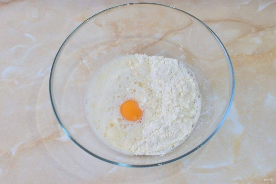 Для приготовления кляра налейте в чашу пиво. Добавьте яйцо и муку.