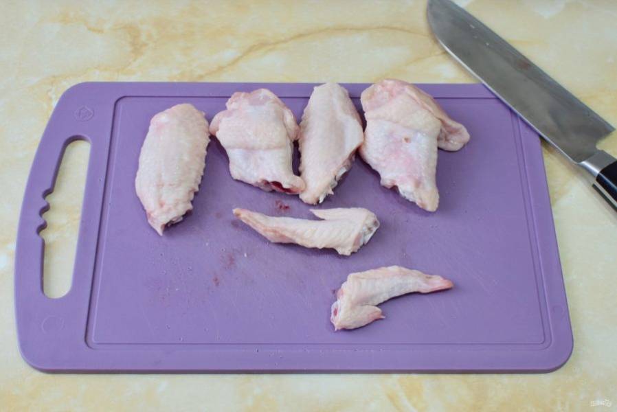 Каждое крылышко разрежьте по суставу на 3 части. Самая маленькая нам не пригодится, так как в ней почти нет мяса.