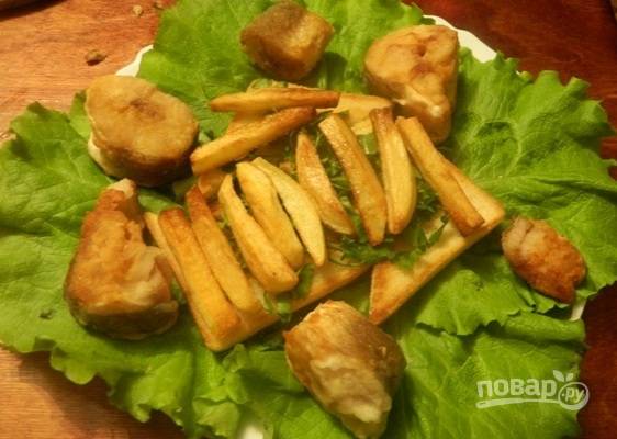 Затем на хлеб с петрушкой выложим обжаренный картофель, а на листья салата — жареный хек.