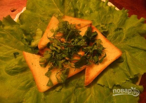 Листья салата необходимо хорошо помыть и высушить. Затем выкладываем их на блюдо, дальше выкладываем тосты и посыпаем их мелко нарубленной петрушкой.