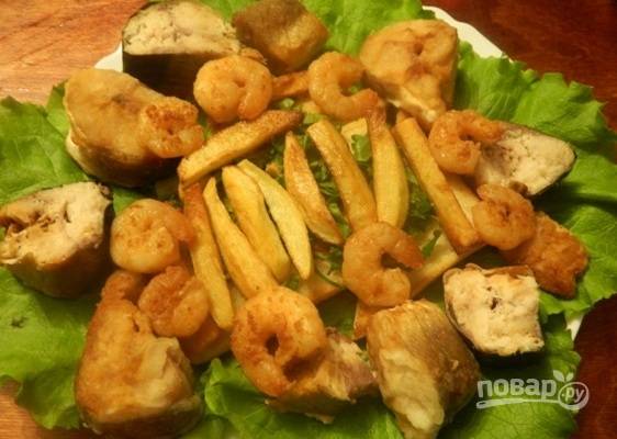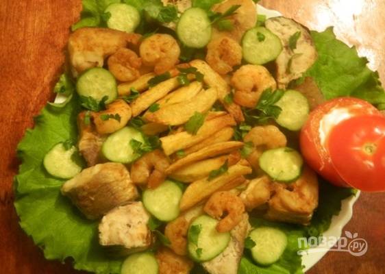 Раскладываем кусочки скумбрии, креветки. Не лишним на этой тарелке был бы замаринованный лук :)