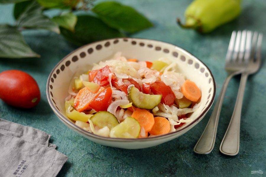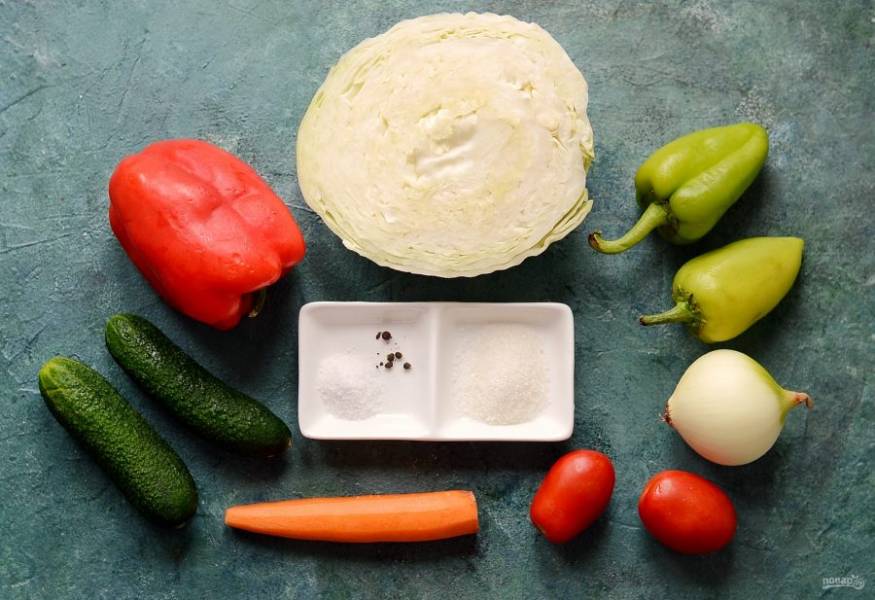Соедините все ингредиенты. Влейте уксус, растительное масло, добавьте оставшийся перец горошком, соль и сахар. Все перемешайте.