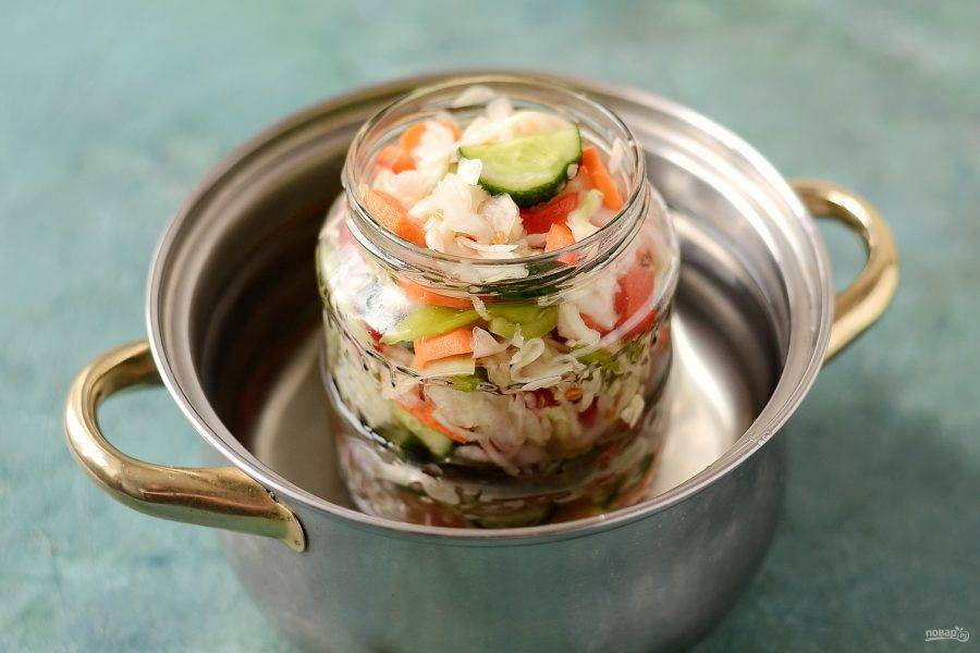 Прикройте банки крышками, стерилизуйте в кипящей воде 20 минут (для банок объемом 0,5 литра). Затем остудите и уберите на 1-2 дня в прохладное место.