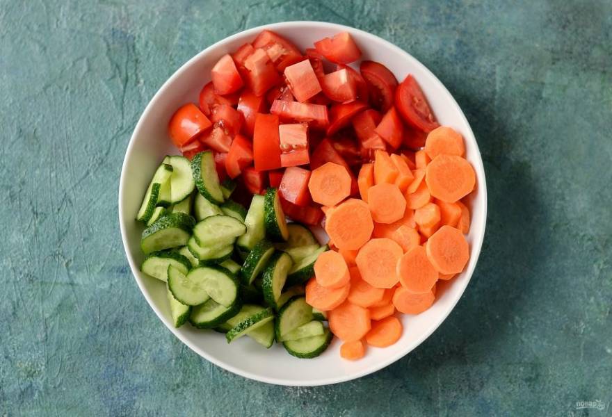 Помидоры, огурцы и морковь нарежьте кружочками или ломтиками средней толщины.