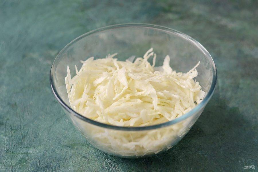 Капусту тонко нашинкуйте. Немного присолите (из общего количества соли) и добавьте немного сахара, помните руками, чтобы она слегка пустила сок.