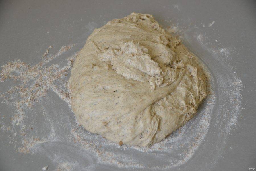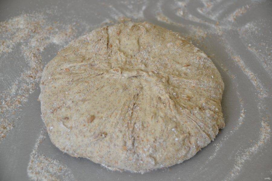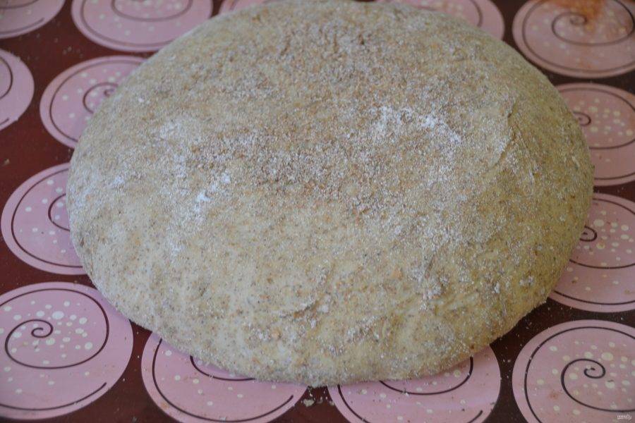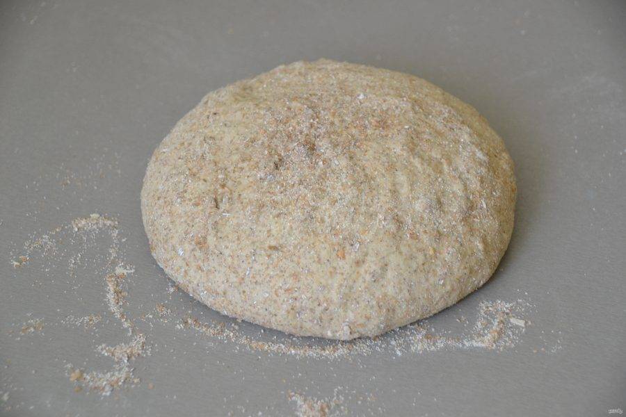 Рабочую поверхность стола присыпьте смесью отрубей с мукой и выложите тесто.