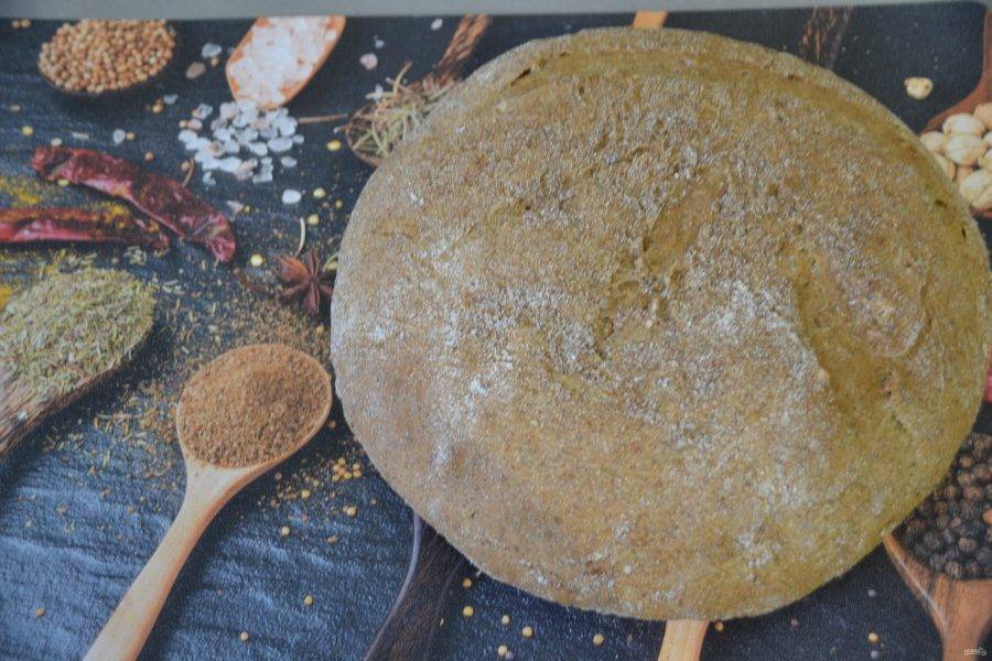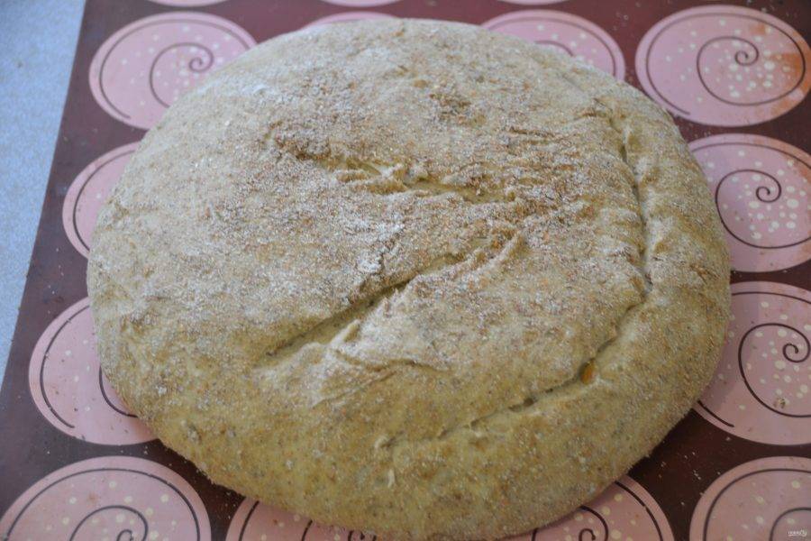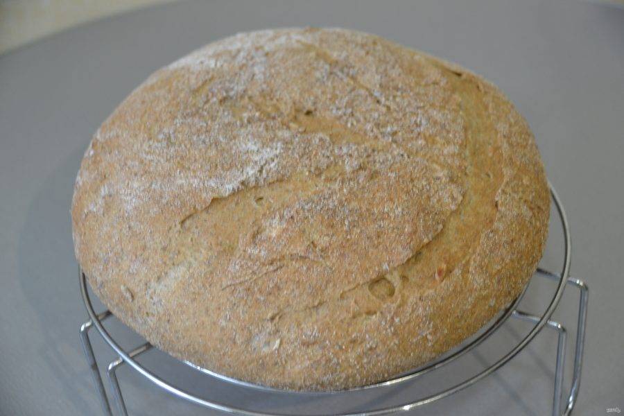 Выпекайте хлеб в уже разогретой духовке, предварительно сбрызнув водой, 10 минут при максимальной температуре 250 градусов, после чего откройте духовку, выпустите лишний пар и запекайте еще в течение 50 минут при температуре 150 градусов. Готовый хлеб выберите на решетку и дайте полностью остыть, так как процесс выпечки еще не окончен.