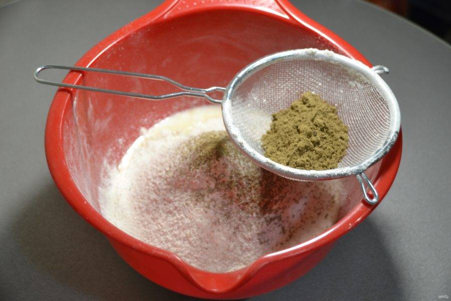 Просейте в миску все виды муки – конопляную, ячменную и пшеничную.