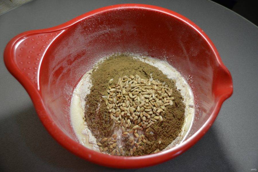 Добавьте соль, сахар, ядра подсолнечных семян, влейте одну столовую ложку подсолнечного масла.