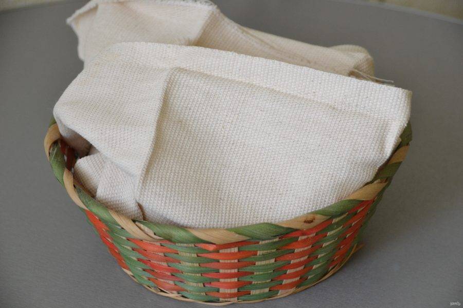 Подготовьте расстоечную корзину, если специальной корзины нет, можно использовать обычную хлебную корзинку, застелив её салфеткой, щедро присыпанной смесью муки и отрубей.