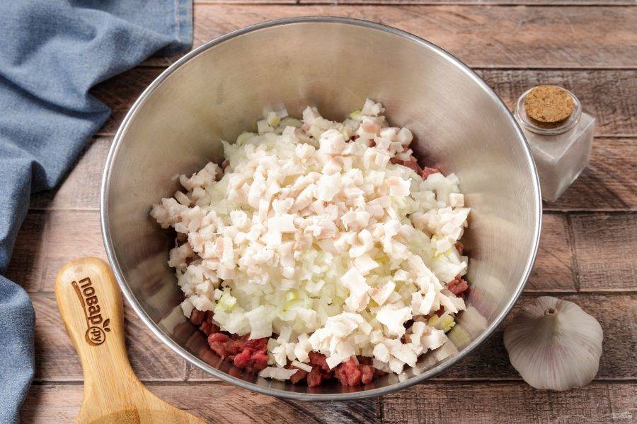 Подмороженное сало нарежьте мелким кубиком. Лук так же нарежьте мелкими кубиками, чем мельче получится, тем лучше.