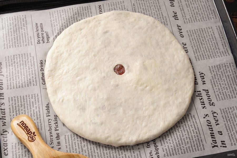 Аккуратно, сначала руками, а потом скалкой, сформируйте круглую лепешку. Тесто должно быть тонкое, но без разрывов. В середине лепешки сделайте маленькое отверстие для выхода пара. Выпекайте на пергаменте или антипригарном покрытии при 180 градусах около 25 минут до приятного золотисто-коричневого цвета.
