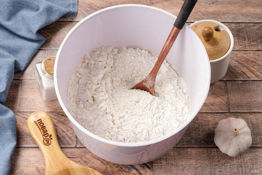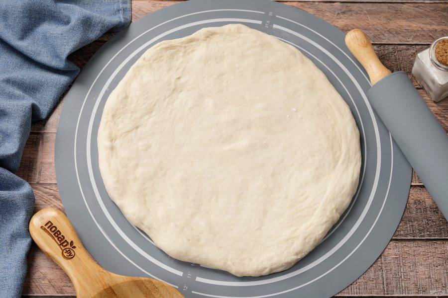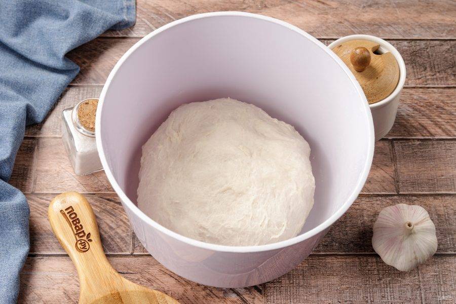 Замесите гладкое, не липнущее к рукам тесто. Готовое тесто накройте пленкой и оставьте в теплом месте до двухкратного увеличения объема, примерно на полтора часа.