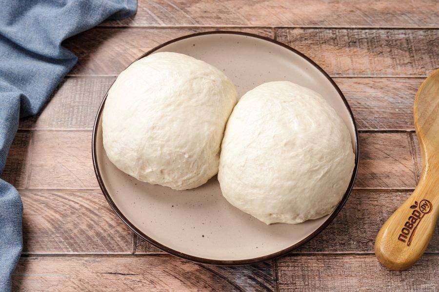 Разделите тесто на две части, сформируйте в шар и дайте расстояться 15 минут под пленкой.
