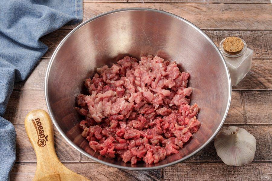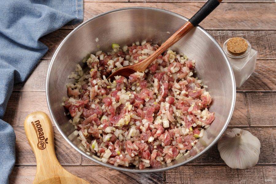 Хорошо перемешайте и оставьте мариноваться в холодильнике на 1,5-2 часа (допускается использование другого мяса — жирная свинина и телятина, только свинина, баранина и свинина и т. п.).