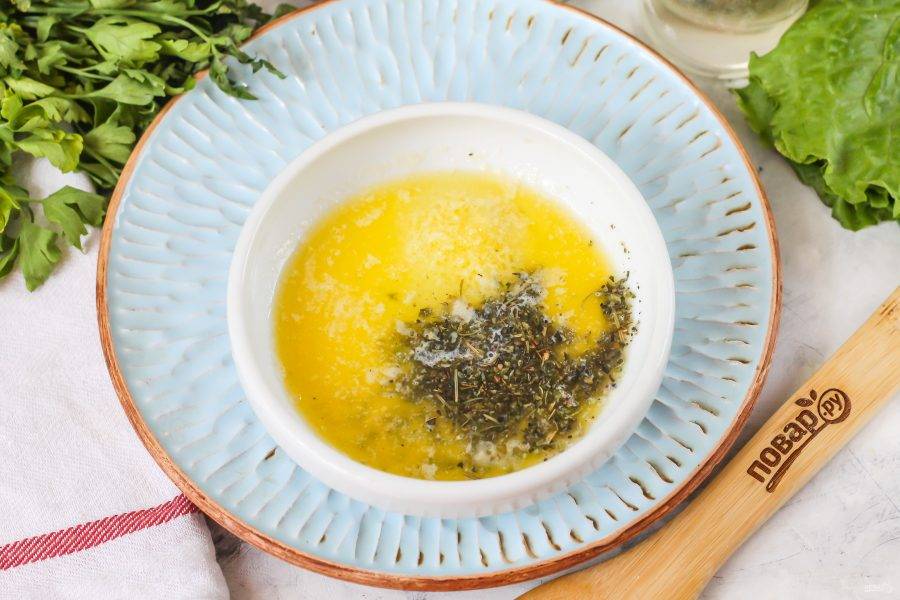 Поместите емкость в микроволновку и прогрейте около 1 минуты, чтобы масло растопилось. Можно добавить и молотый чеснок, если любите его вкус.