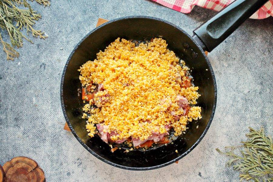 Кукурузную крупу промойте в теплой воде, дайте стечь воде и высыпьте поверх тушенки и овощей.