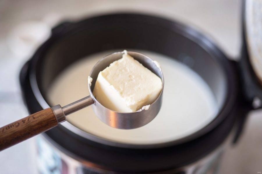 Добавьте сливочное масло. Закройте крышку мультиварки, установите на панели управления режим «Молочная каша» на 1 час. Как только прозвучит финальный сигнал об окончании программы приготовления, откройте крышку и перемешайте кашу.