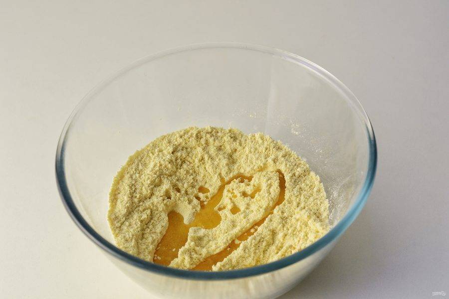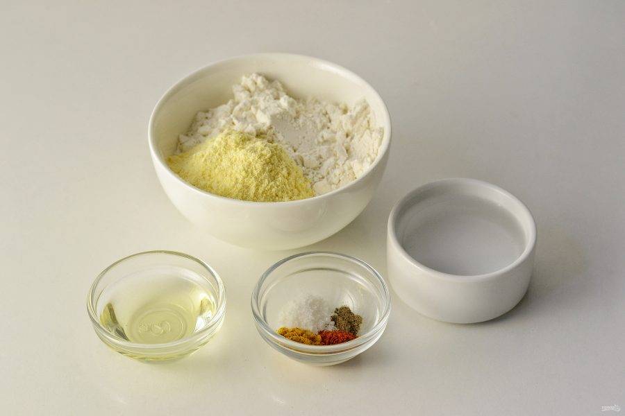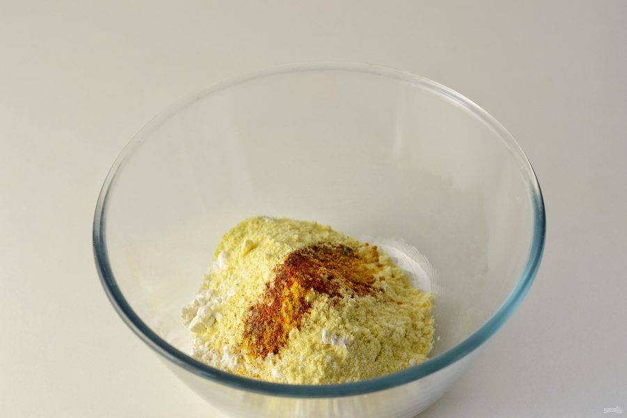 Просейте кукурузную и пшеничную муку в большую миску. Перемешайте. Добавьте соль и все специи.