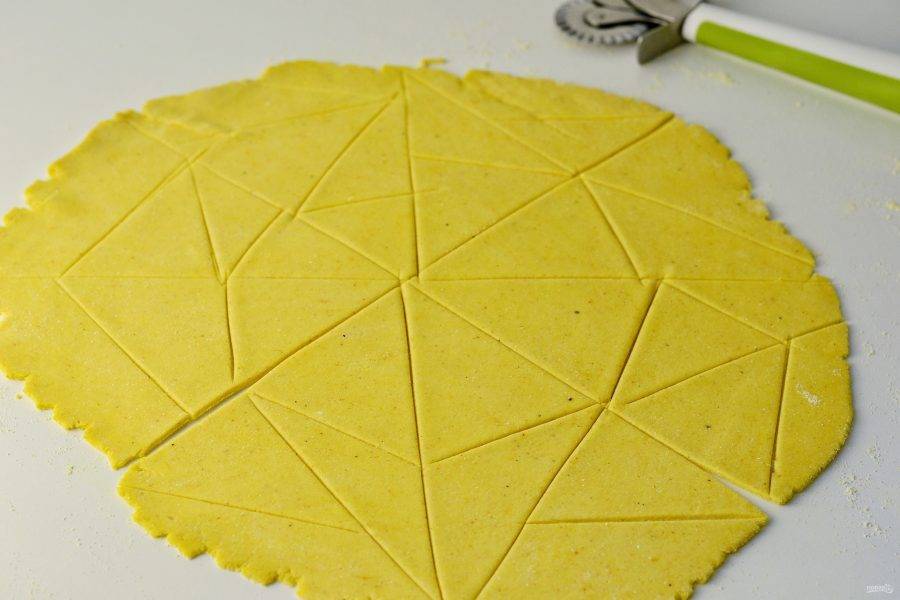 Раскатайте тесто как можно тоньше, накалите вилкой. Нарежьте на треугольники. Удобнее это делать ножом для пиццы.