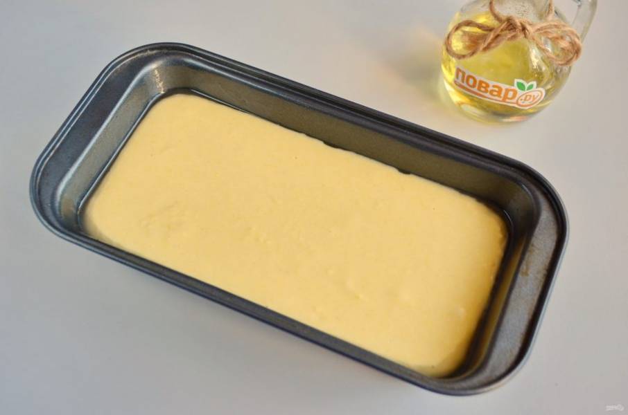 6. Смажьте хорошо маслом форму, вылейте тесто и поставьте в горячую духовку на 20 минут, затем убавьте температуру до 200 и пеките еще 10-15 минут.