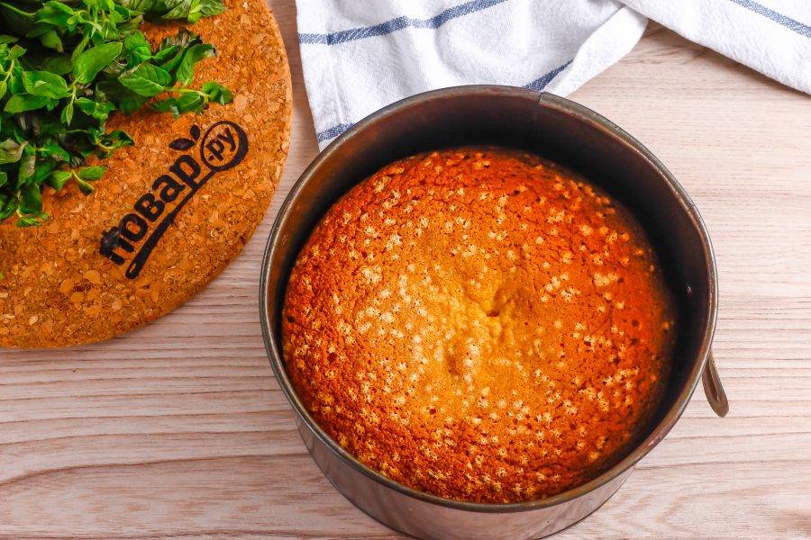 Если бисквит подрумянится, но в середине будет еще не пропеченным, накройте форму фольгой и допеките десерт. При извлечении выложите форму на бок, чтобы выпечка не опала.