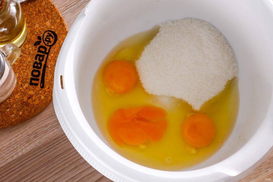 Вбейте куриные яйца в емкость миксера или кухонного комбайна. Всыпьте туда же сахар и соль. Взбейте в течение 3-5 минут. Масса должна побелеть и увеличиться в два-три раза.