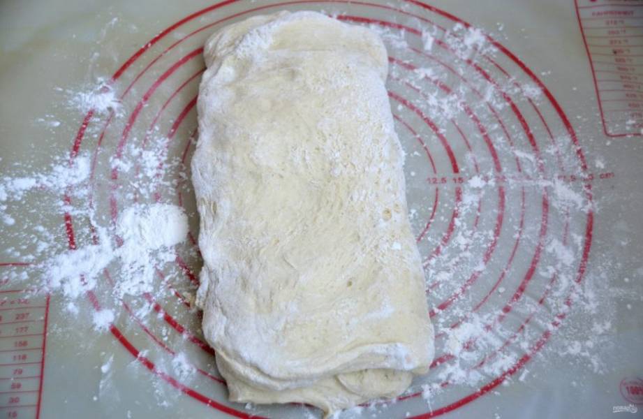 Распрямите пласт теста и сложите конвертом, сначала встречно две стороны.