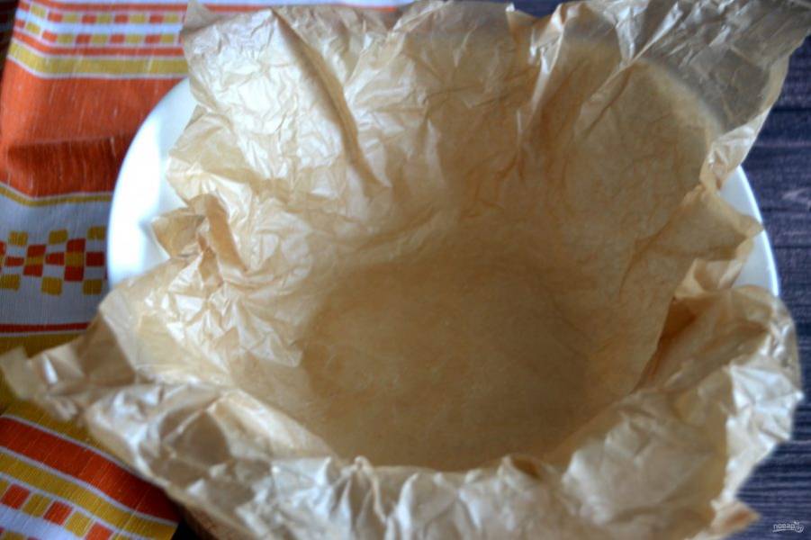 Подготовьте миску, застелите бумагой для выпечки, предварительно помяв и смочив ее для эластичности. Если не уверены в качестве бумаги, можно слегка присыпать ее мукой.