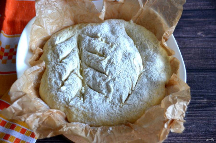 Слегка присыпьте поверхность теста мукой и сделайте надрезы острым ножом или лезвием бритвы, чтобы пар в процессе выпечки мог выходить.