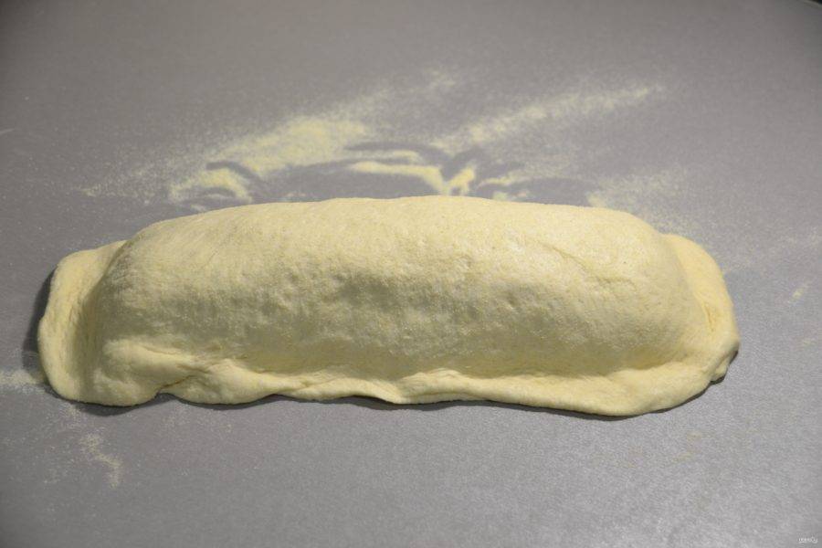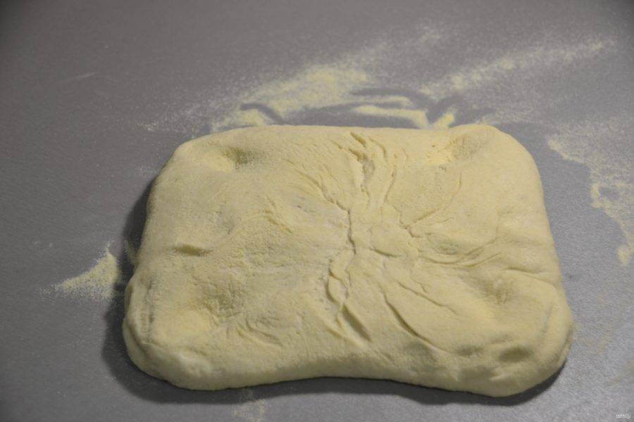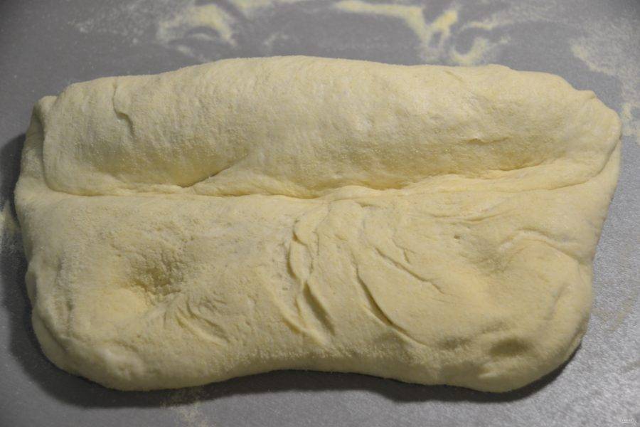 Через 30 минут разверните тесто, слегка растянув его в стороны, образуя прямоугольник.