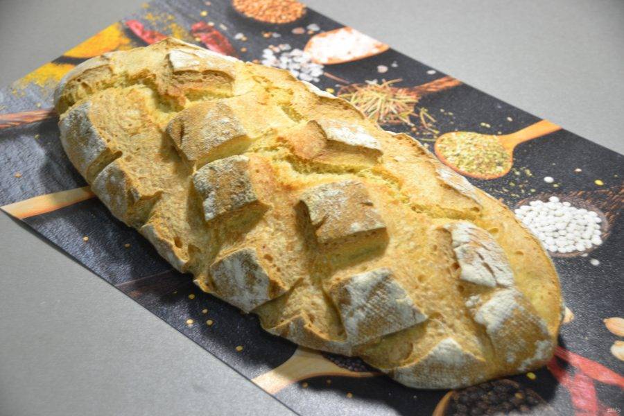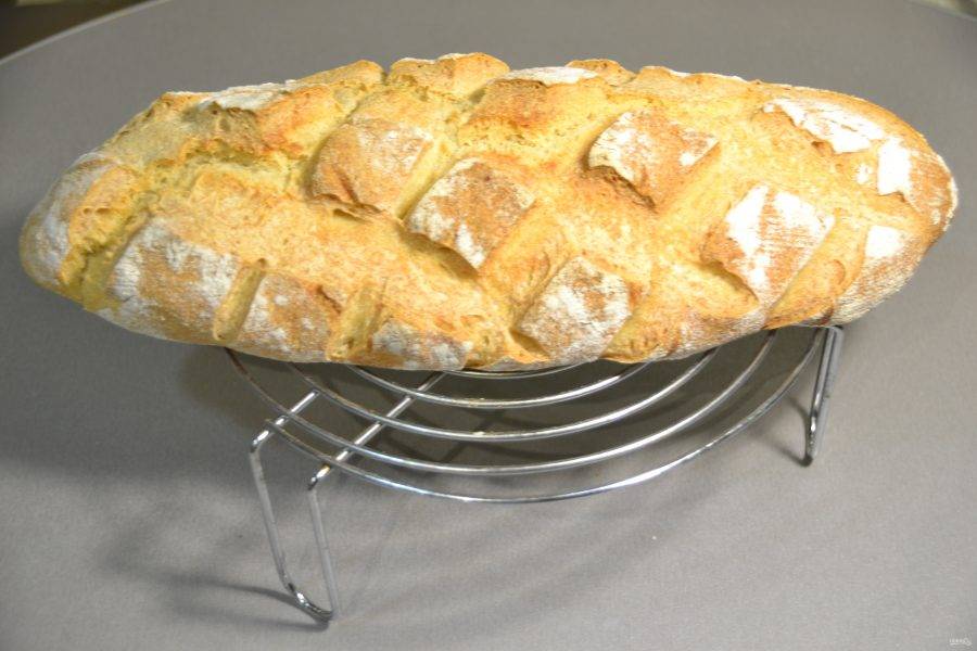 Отправьте хлеб в предварительно разогретую до максимальной температуры (у меня 250 градусов) духовку, сбрызнув стенки водой, вниз можно поставить противень с водой. Выпекайте 10 минут при такой температуре, затем выпустите пар и продолжайте выпекание в течение 40-50 минут при температуре 180-200 градусов. Готовый хлеб переложите на решетку и дайте полностью остыть.