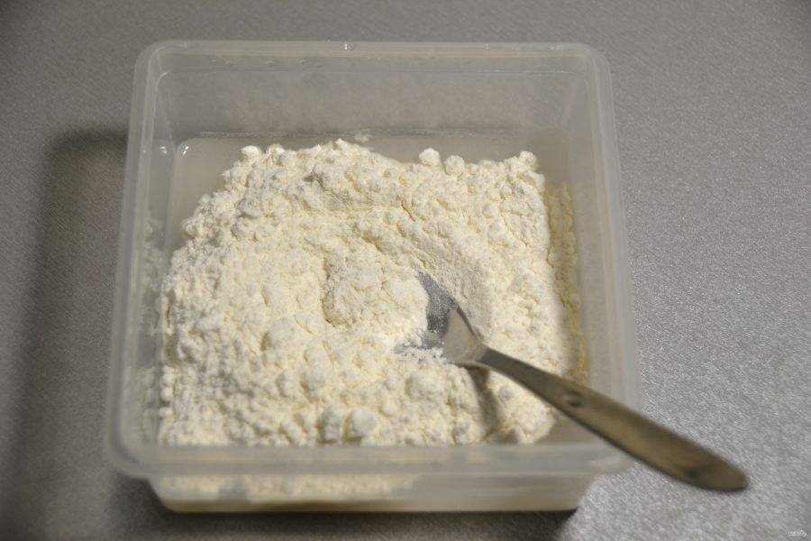 Всыпьте 45 г пшеничной муки и перемешайте.