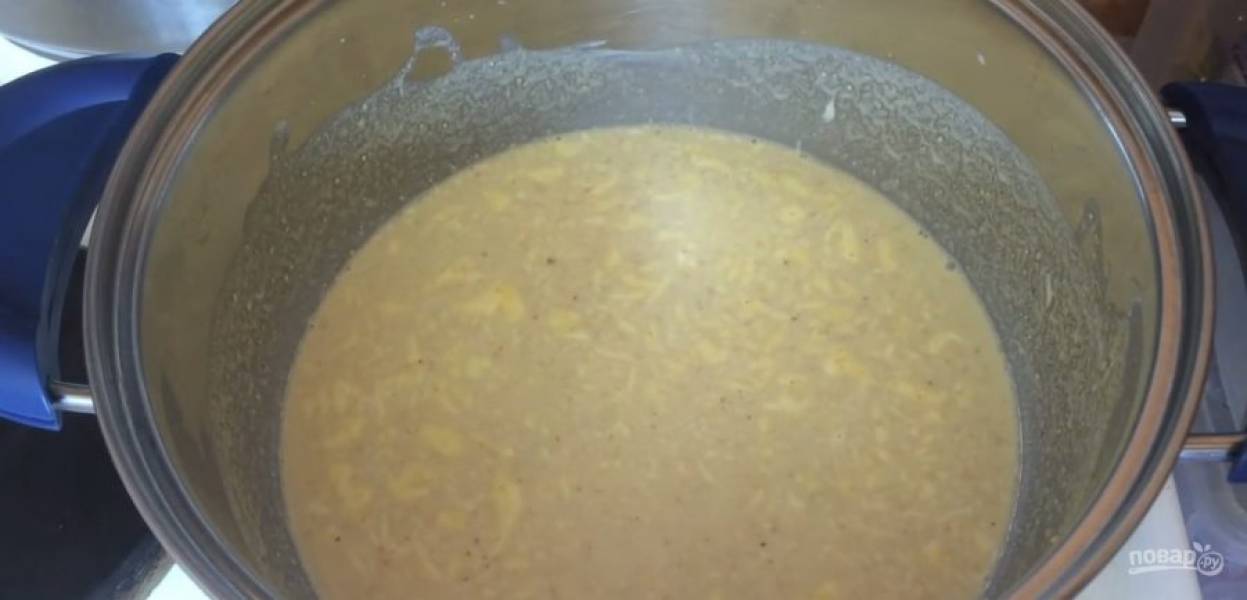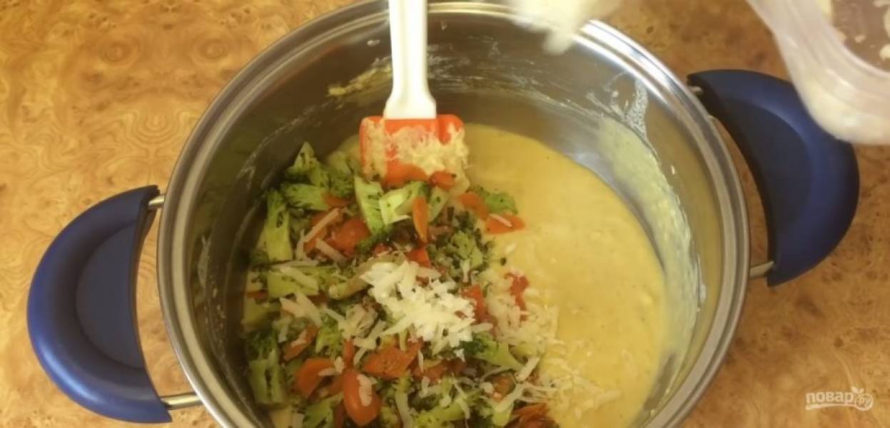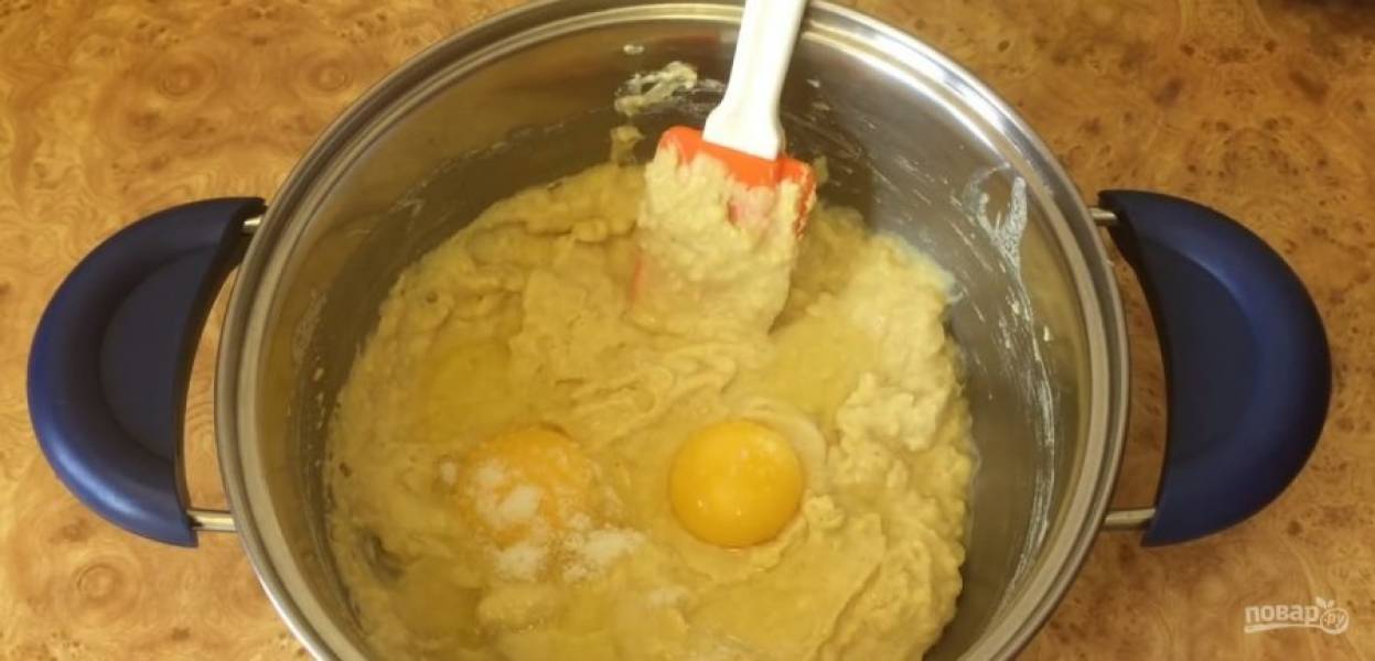 Обжарьте овощи на небольшом количестве растительного масла под крышкой, периодически перемешивая. Дайте начинке остыть. В кастрюлю с мучной смесью добавьте яйца, соль и перемешайте до однородности.
