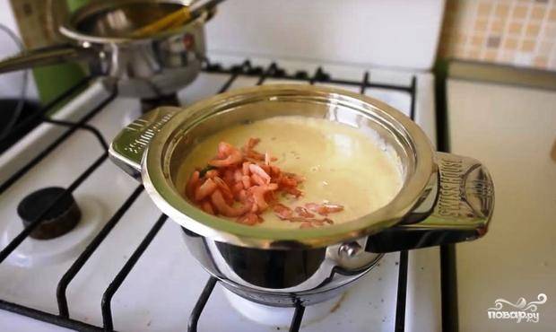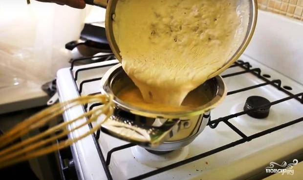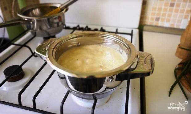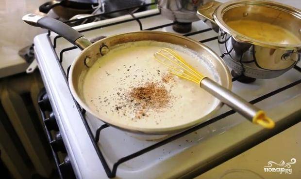 На сковороде разогреваем 2 ст. ложки сливочного масла, добавляем муку. Немного поджариваем, постоянно помешивая, и добавляем сливки, соль, черный молотый перец, мускатный орех. Доводим до кипения и убираем с огня.