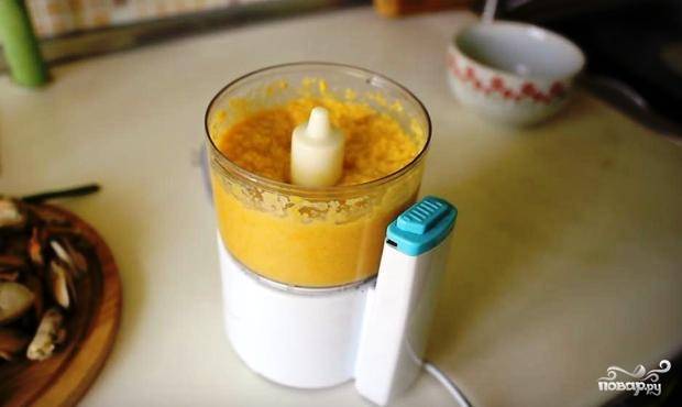 Сливаем жидкость из банки с кукурузой, выкладываем кукурузу в блендер и измельчаем её в пюре.