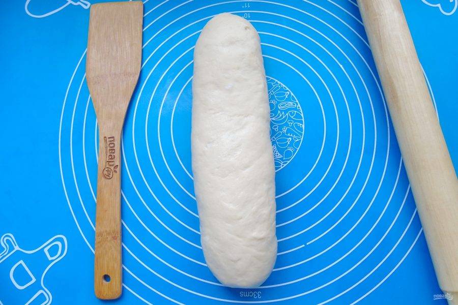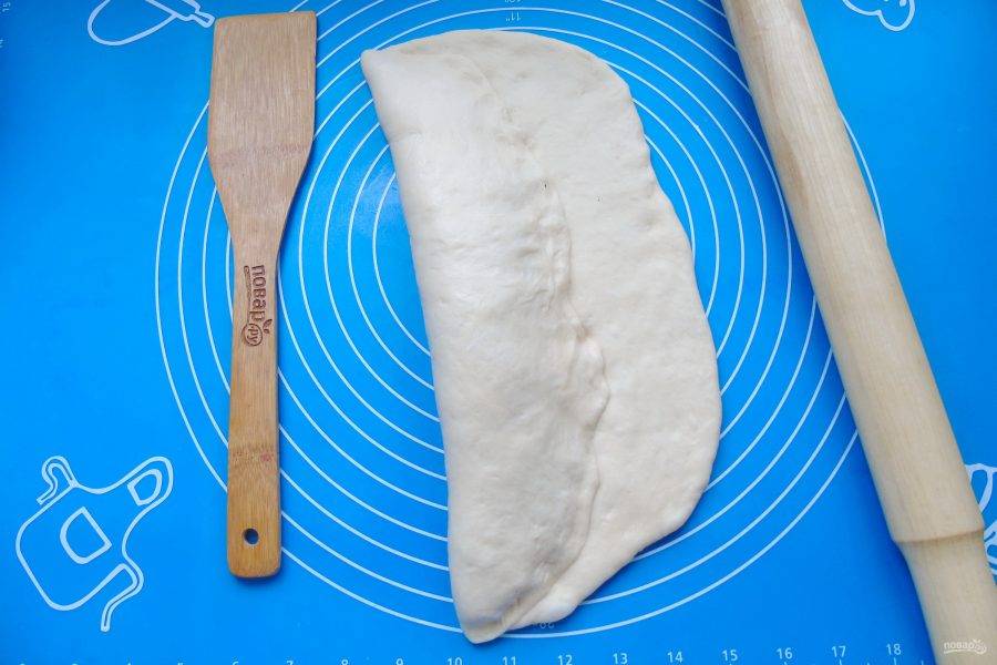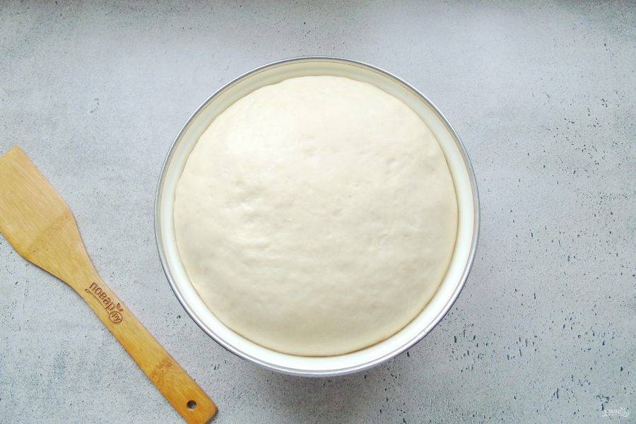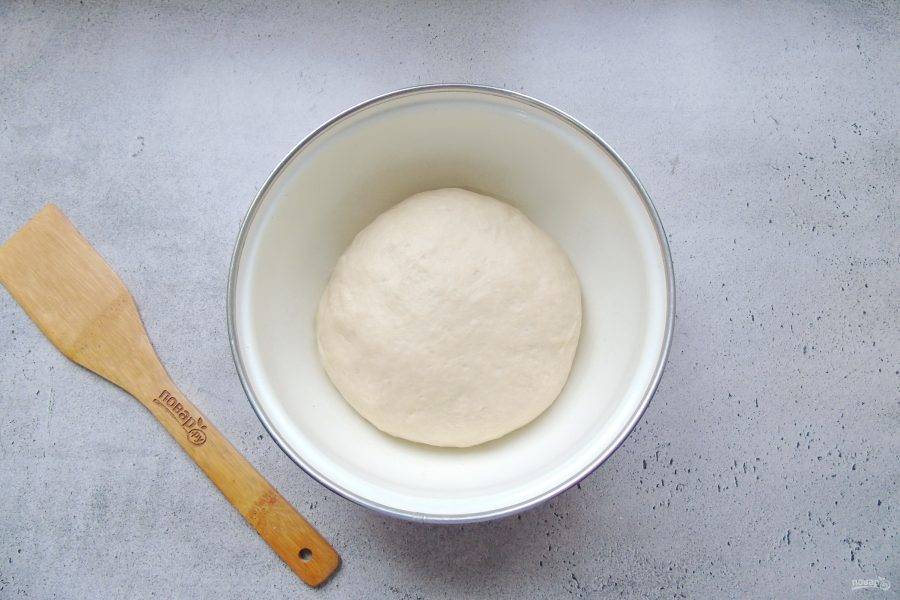 Замесите достаточно крутое, но эластичное и мягкое тесто, не липнущее к рукам. Накройте миску с тестом пленкой или полотенцем и поставьте в теплое место.