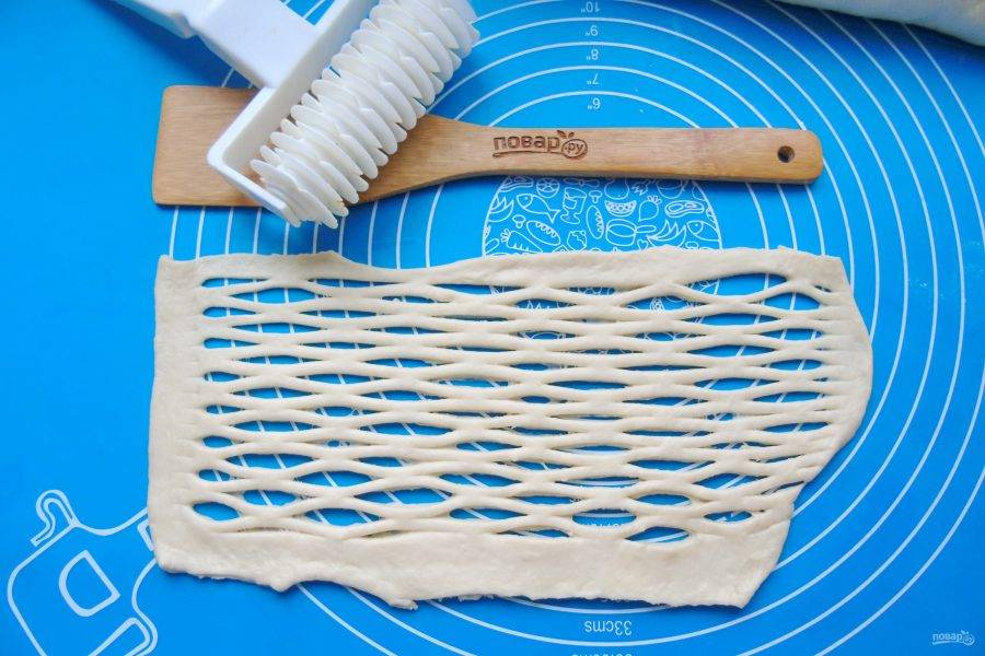 От второй части теста отрежьте небольшой кусочек и раскатайте его. С помощью специального валика сделайте надрезы.