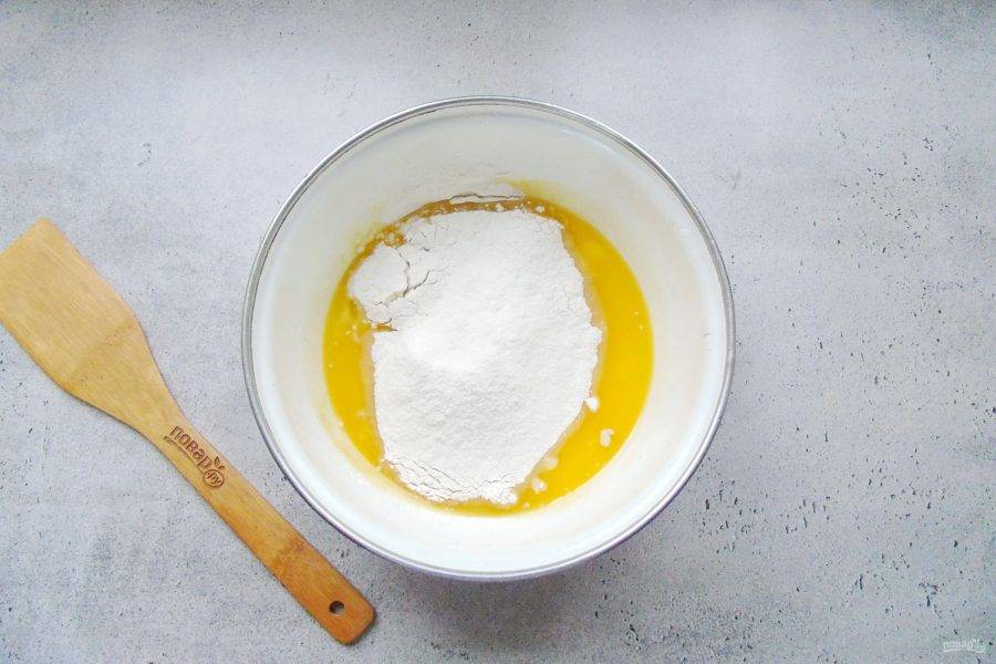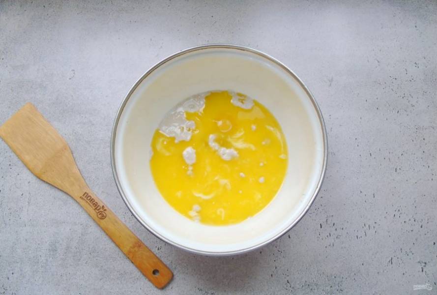 Сливочное масло растопите, немного охладите, добавьте в миску, разбейте яйцо.