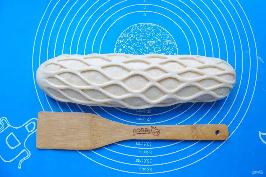 Полученной сеткой накройте батон и закрепите края. Одна кулебяка готова.