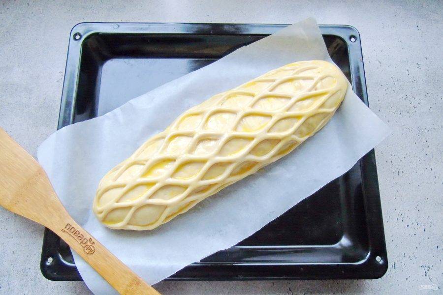 Кулебяку выложите на противень, накройте пленкой и дайте постоять при комнатной температуре 30-35 минут. После смажьте яйцом и отправьте в духовку.