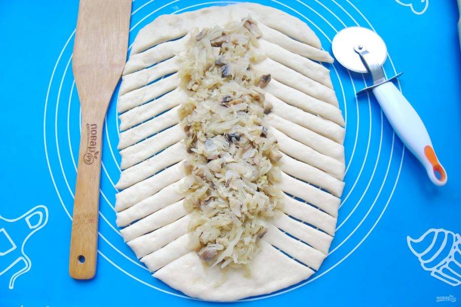 Вторую часть теста точно также раскатайте в пласт. Выложите начинку и сделайте по бокам надрезы, как показано на фото.