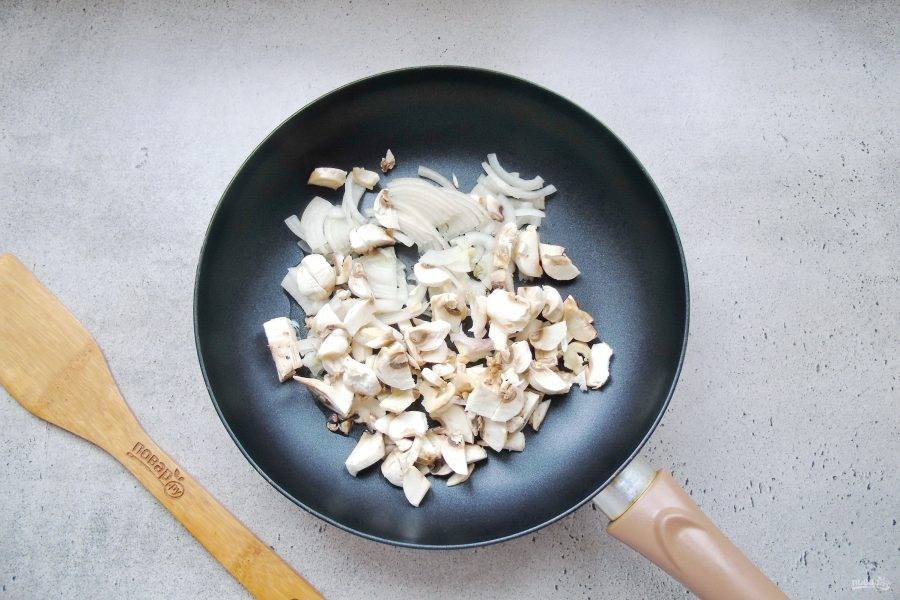 А пока тесто подходит, приготовьте начинку для кулебяки. Репчатый лук и шампиньоны нарежьте произвольно и выложите в сковороду.