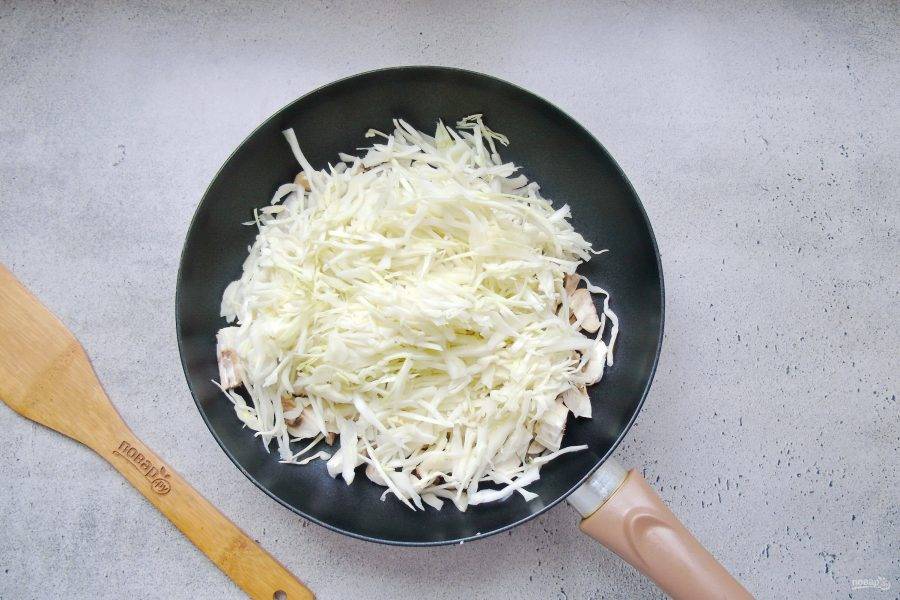 Капусту нарежьте соломкой и добавьте к луку и грибам. Налейте подсолнечное масло и 50-60 мл. воды. Посолите и поперчите.