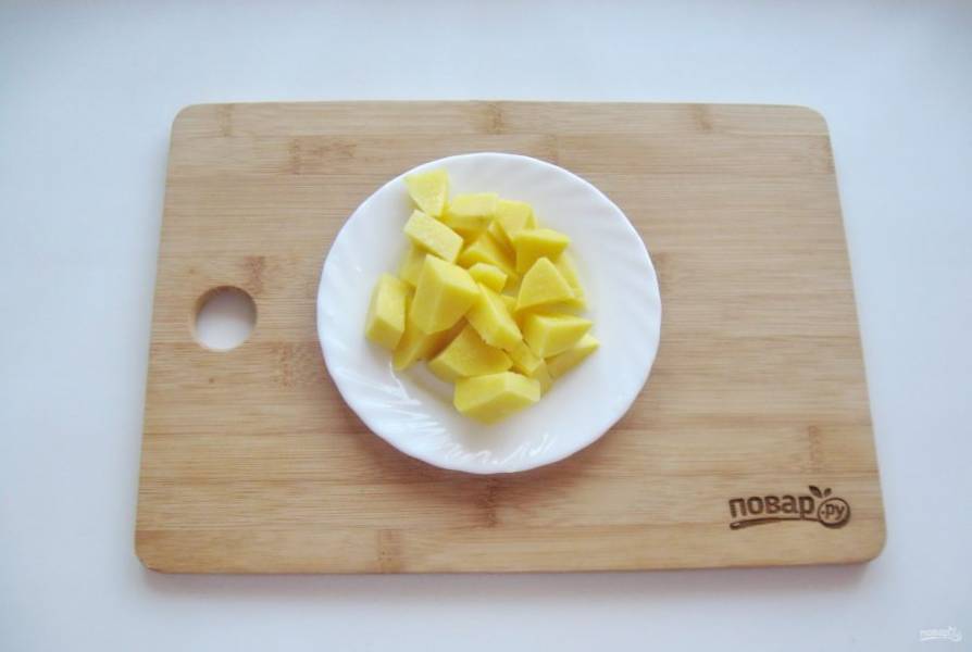 Картофель очистите, помойте и нарежьте кубиками. Выложите в кастрюлю с пшеном.