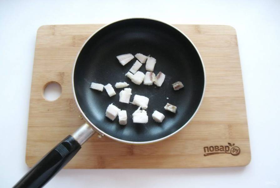 Сало нарежьте кубиками и выложите в сковороду.