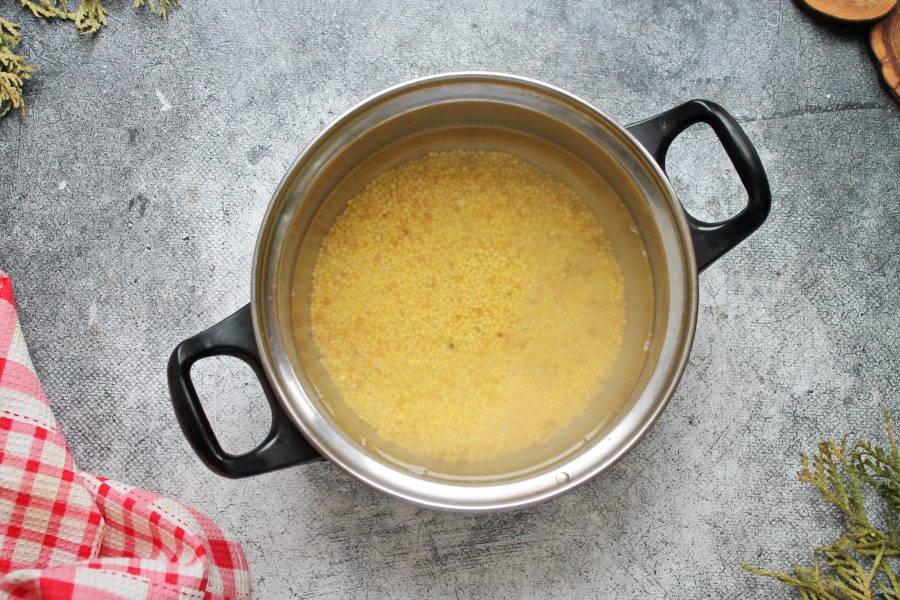 Пшено переберите и залейте горячей водой, дайте постоять 15 минут. Откиньте пшено на сито и промойте.