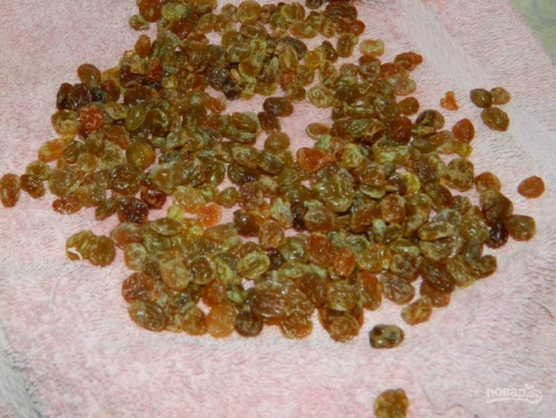 Изюм залейте кипятком на 10 минут. Затем промойте и обсушите.