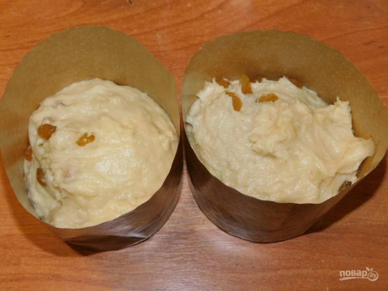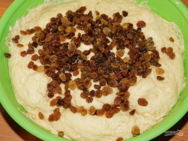 Добавьте изюм в тесто. Перемешайте и дайте подойти еще раз в течение 1-1,5 часов.