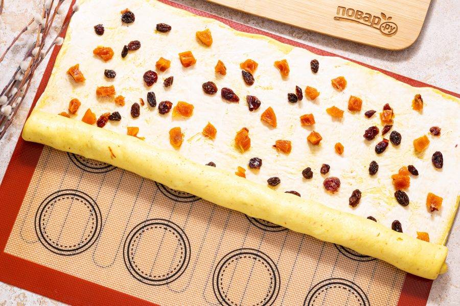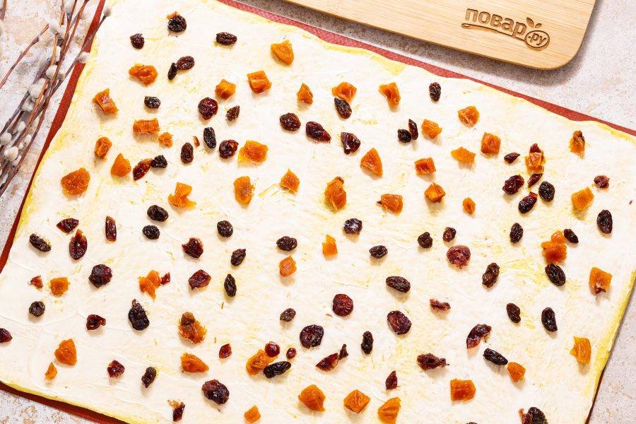Слейте жидкость от сухофруктов и чуть их обсушите, затем выложите по всей поверхности теста.